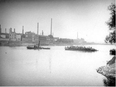 De stoomsleepboot "Gabriëlle" trekt een veerpont tussen het Stadspark en het Waterpoortje. Bron: collectie Dhr. Alexander Closset jr.