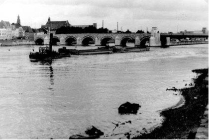 Het gezin Adriaens op de Gabriëlle, het werkpaard van sleepbootkapitein J.L. Adriaens. Dhr. Adriaens had het geluk vast te komen liggen op een zandbank ter hoogte van Ternaaien; zo ontliep hij bij toeval het zware bombardement uitgevoerd door Amerikaans bommenwerpers op de spoorbrug te Maastricht op 18 augustus 1944. Bron: collectie familie Adriaens.
